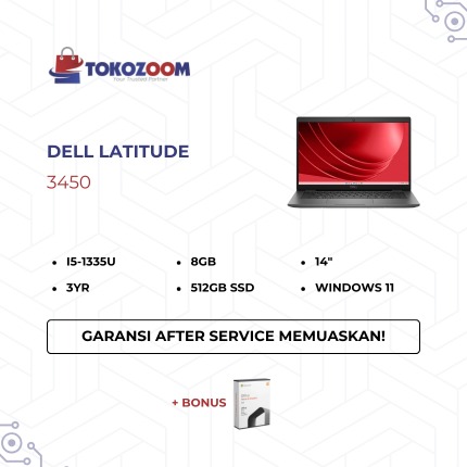 Dell Latitude 3450 / Intel core i5-1335U Generasi ke-13 (cache 12 MB, 10 inti, Turbo hingga 4,60 GHz) / 14,0" FHD (1920x1080) Non-sentuh, AG, IPS, 250 nits, KameraFHD, WLAN / Keyboard hotkey AI dengan lampu latar inggris AS, 79 tombol/ 8GB: 1x 8GB, DDR5, 5600 MT/dkt (5200 MT/dtk dengan prosesor intel core generasi ke-13)/ Grafis iris Xe atau UHD Terintegrasi Intel/ 512 GB, M.2 2230, QLC PCle Gen 4 NVMe/ Baterai 3-sel, 42 Wh, pengisian daya cepat, mendukung pengisian daya cepat/ Tas kerja Dell Essential/ Windows 11 pro? Generasi 3 tahun dukungan pro